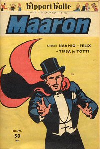 #KK12 Kippari Kalle 1954-09 Julkaisija: Sanoma Osakeyhtiö Sivut: 32 Väri: värillinen Hinta: 50 mk Lisätietoja: Mustanaamio esiintyy nimellä Naamio. Sisältää myös muita, ei Naamio -aiheisia tarinoita. Mustanaamio (Kippari Kalle): "Naamio ja “Vedenjumala Lago”" |